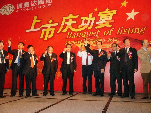 (黄育鹏董事长在振鹏达集团上市庆功宴上与各界贤达举杯共庆)