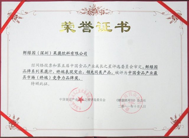 10月8日,作为中国食品领域最具权威和影响力的品牌活动——中国食品产业成长之星评选活动在沈阳全国秋季糖酒会期间举行隆重的颁奖典礼。会上揭开了最具成长性企业奖、最具市场(终端)竞争力品牌奖、杰出贡献奖等五个奖项。鲜绿园(深圳)果蔬饮料有限公司荣揽中国食品产业“最具市场(终端)竞争力品牌奖”。