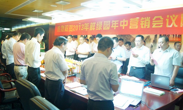 7月8日至10日,为更快、更好完成集团公司2013年销售任务,全面贯彻黄育鹏主席提出的发展战略方针,鲜绿园华南、华东、西南、西北、东北、福建营销大区负责人、各区域经理,集团公司董事局主席黄育鹏、副总裁黄育珊、鲜绿园公司副总裁朱俊、营销中心总经理曾明、副总经理强新录及总裁办、生产部、财务部、品牌管理部、审计部、人资行政部相关负责人共同出席了2013年鲜绿园年中营销会议。
