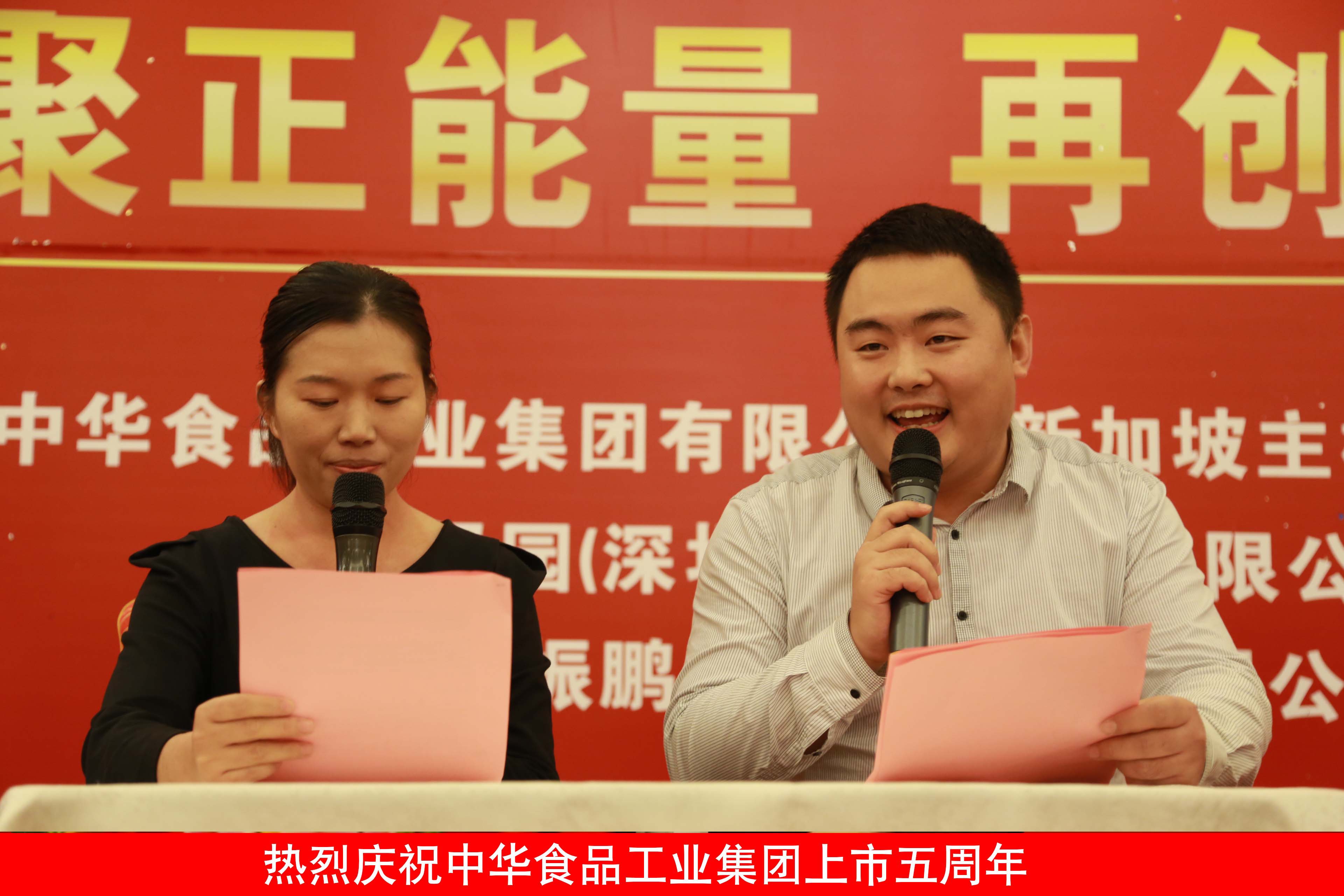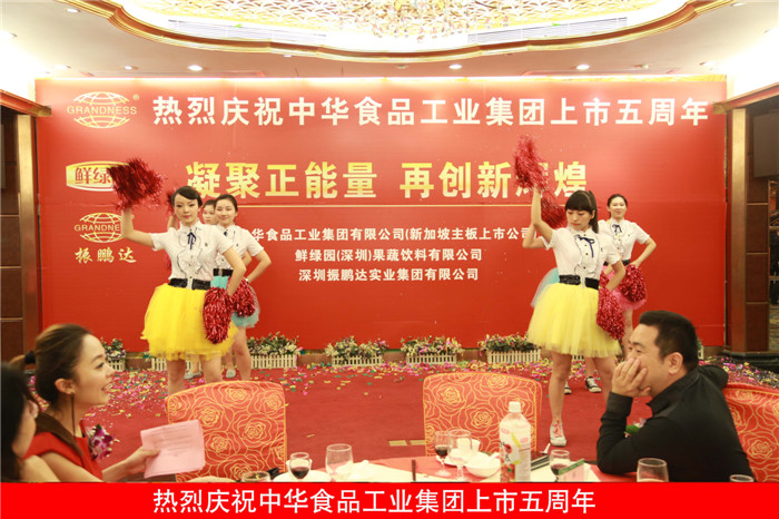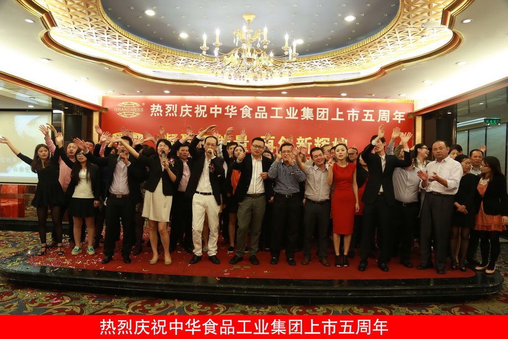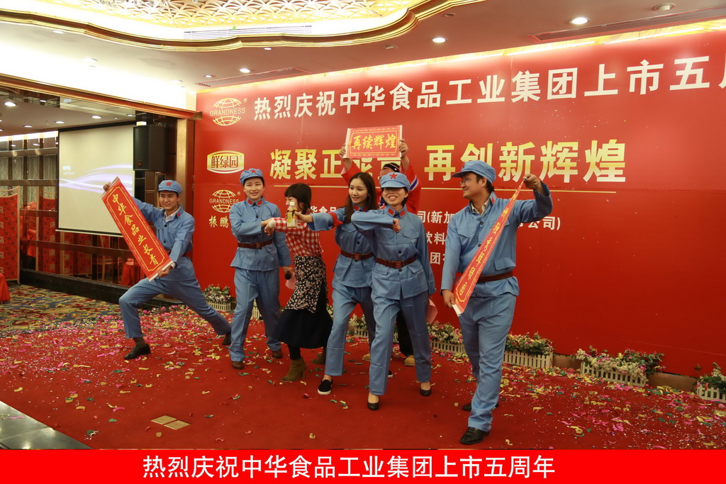 一年一大步,十年一跨越,2014年11月23日,中华食品工业集团上市五周年庆典在深圳隆重举行,并以“凝聚正能量,再创新辉煌”为主题展开文艺汇演,集团上下各部门人员欢聚一堂,同娱同乐,共庆华诞,标志着中华食品工业集团在历史滚滚长河中迎来新的纪元!