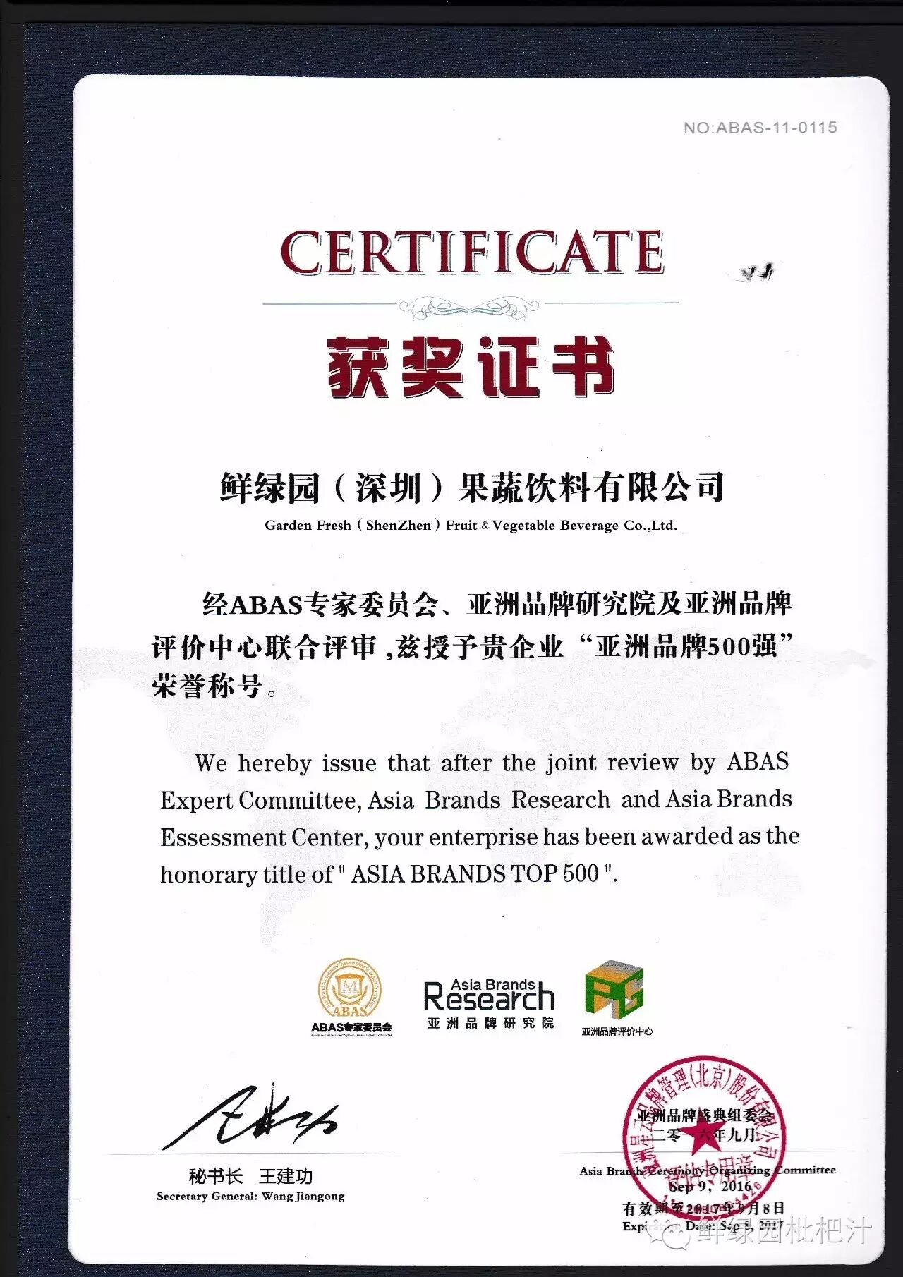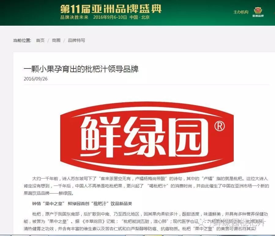 9月9日,第11届亚洲品牌盛典完美收官。此次盛典由亚洲品牌网联合人民日报海外版、新华网共同主办,本届盛典继续以“品牌决胜未来”为主题,亚洲政界领导、品牌领袖、国内外经济学者、媒体记者等近千人出席了本届盛典。鲜绿园荣登“2016亚洲品牌500强”!