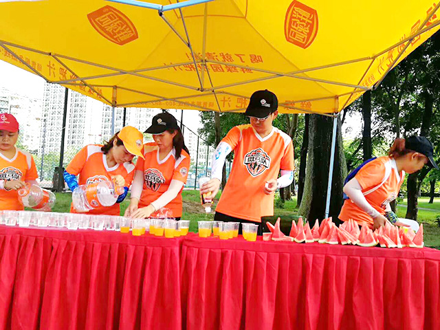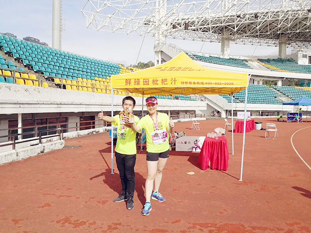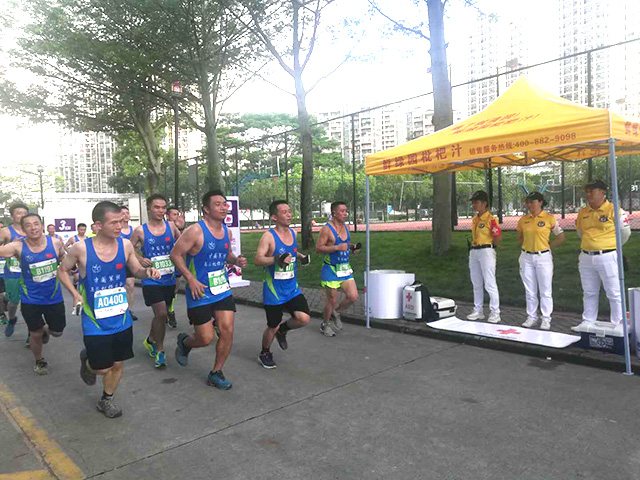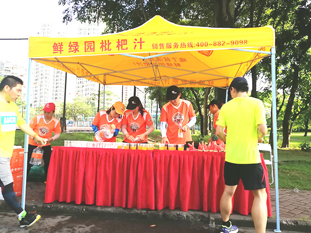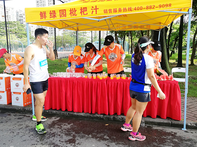 鲜绿园枇杷汁作为本次深圳大学城马拉松赛事官方唯一指定饮料,在体育中心和贯穿大学城各个高校的之间的赛道上共设置了三个补给站,与活动组委会一起为参赛选手源源不断的提供鲜绿园枇杷汁饮品,“清润”助跑!在传递健康生活理念的同时以另一种方式参与全民健身事业,践行社会公益。
