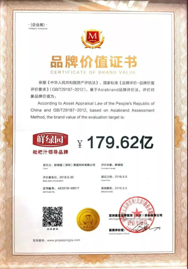 2018年“第13届亚洲品牌盛典”已经圆满落幕,与本次活动相关的各项工作也都接近尾声。日前,Asiabrand正式授予鲜绿园品牌价值证书,并祝贺鲜绿园品牌价值达到179.62亿,再创新高。