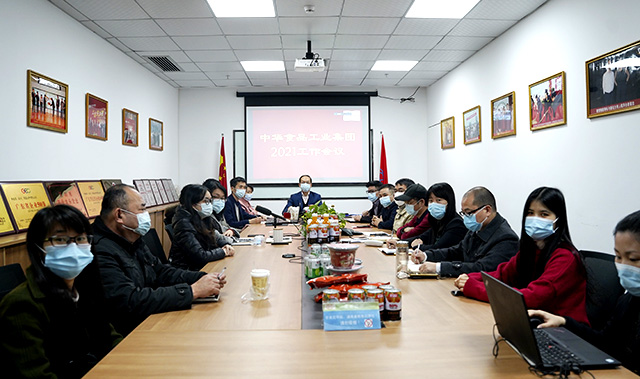 2021年1月8日,中华食品工业集团工作会议在深圳总部召开,集团董事局主席黄育鹏、副总裁黄育珊、朱俊、集团财务部、人资部、审计部、海外部、品牌部、市场部、销售管理部及振鹏达、鲜绿园各区销售负责人出席了本次会议,四川、湖北、山东、山西、安徽工厂总经理通过视频会议系统接入会议。